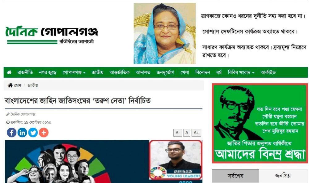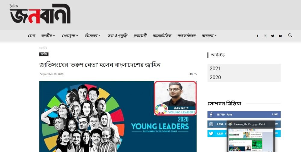 বাংলাদেশের ২২ বছরের তরুণ জাহিন রাজিন টেকসই উন্নয়ন লক্ষ্য বা এসডিজি নিয়ে কাজ করার জন্য জাতিসংঘের ২০২০ সালের ১৭ তরুণ নেতার একজন নির্বাচিত হয়েছেন। টেকসই উন্নয়ন লক্ষ্য নিয়ে যারা কাজ করছেন তাদের জন্য এটিকে পৃথিবীর সর্বোচ্চ স্বীকৃত প্ল্যাটফর্ম বিবেচনা করা হয়।